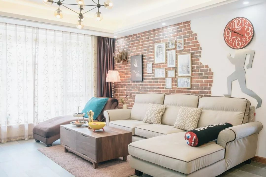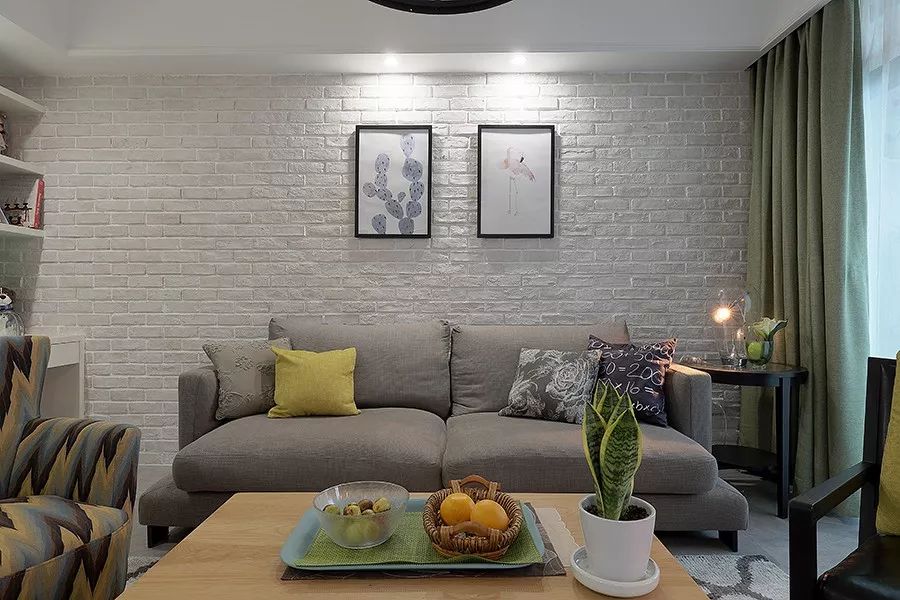 文化砖也是近几年比较流行的设计,除了通铺文化砖之外,也可以选择双拼的设计,用文化砖和乳胶漆构成一个创意十足的沙发背景墙。