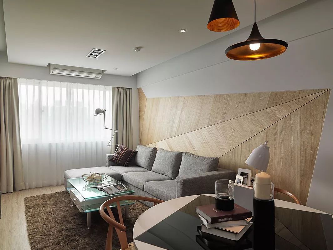 木饰面板也是很适合用在沙发背景墙上的,几块三角形的木饰面板组成一个不规则的几何图形,木材本身的纹理就是最好的装饰。