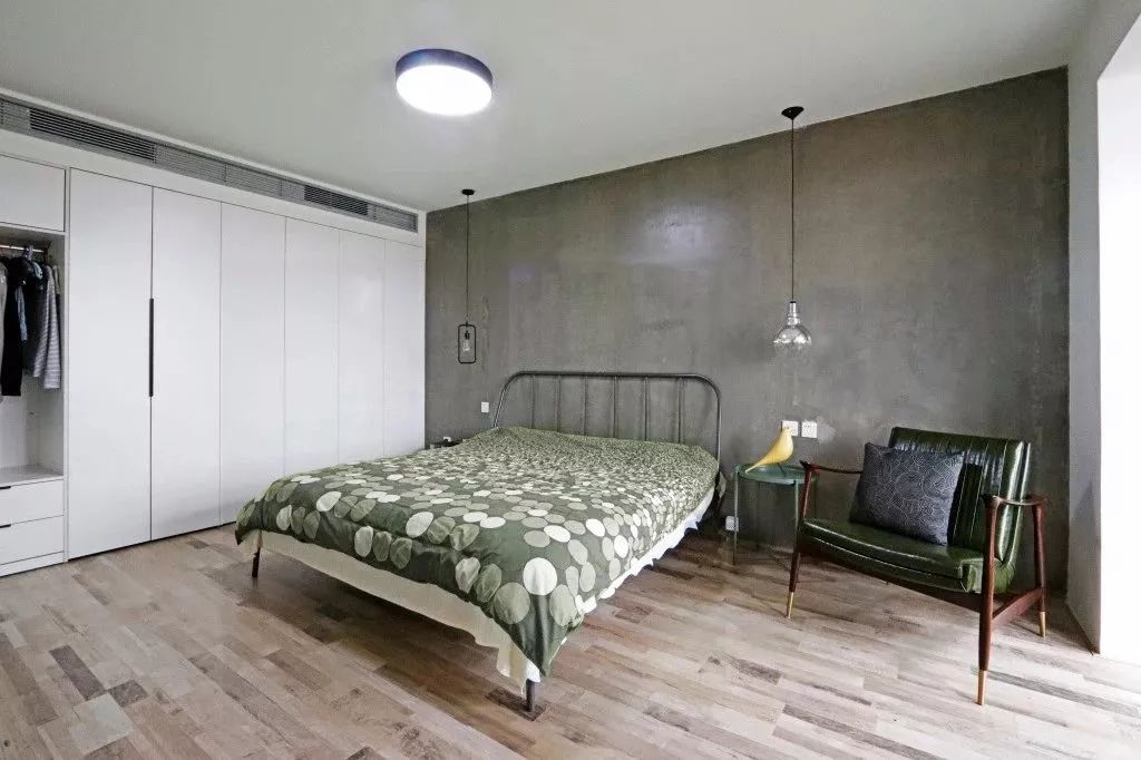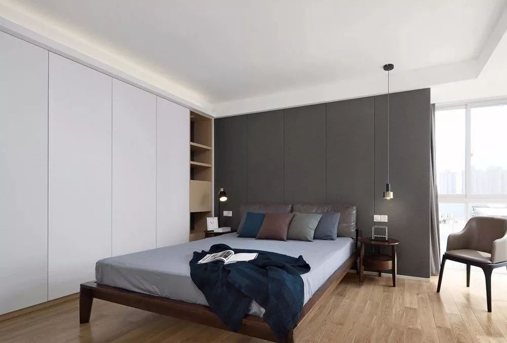 但在外观上却能够让人感觉非常的简洁、舒适,就算是做上了满墙的柜子,也不会觉得卧室太过压抑,搭配轨道灯、筒灯更加好看。
