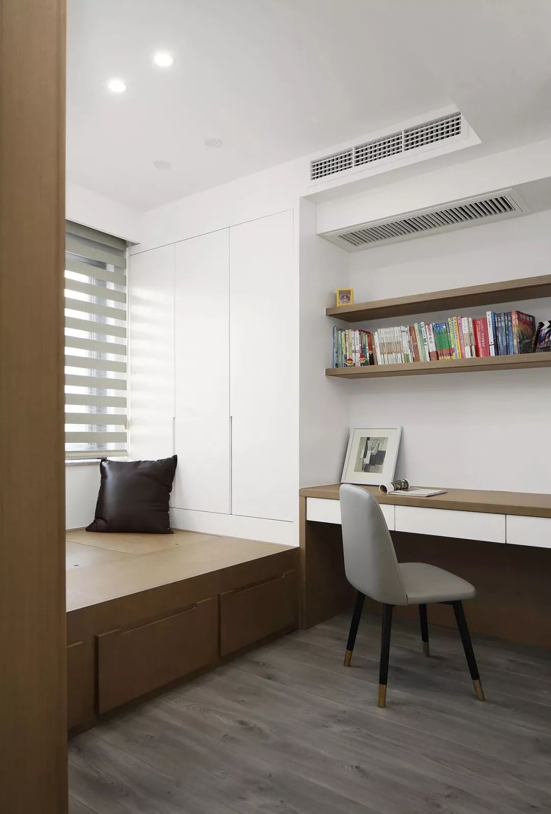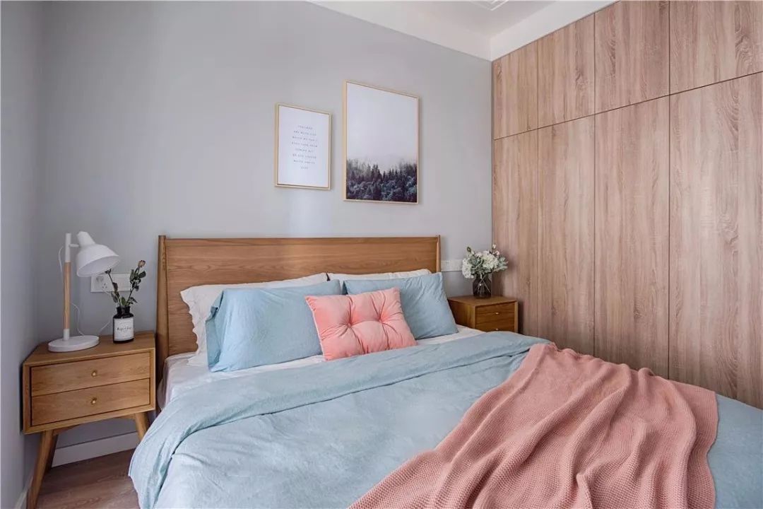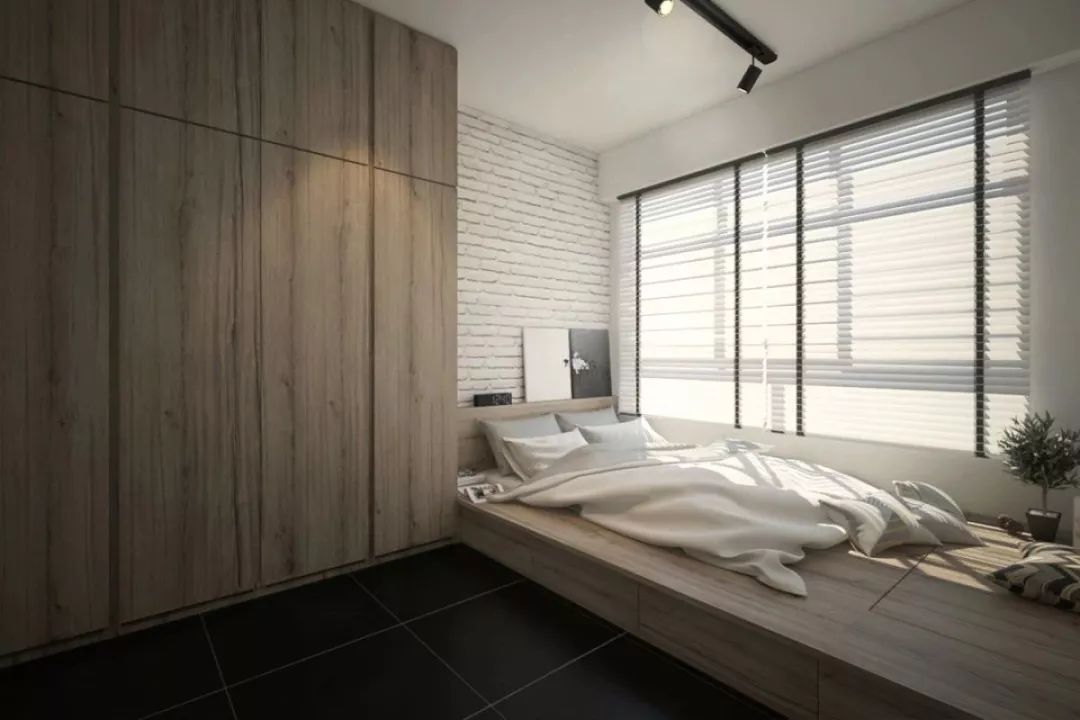 就像上图所示,把床头都嵌入了柜子当中,但白色、木色的结合搭配筒灯,这样的卧室看上去也不会让人感觉拥挤和压抑。