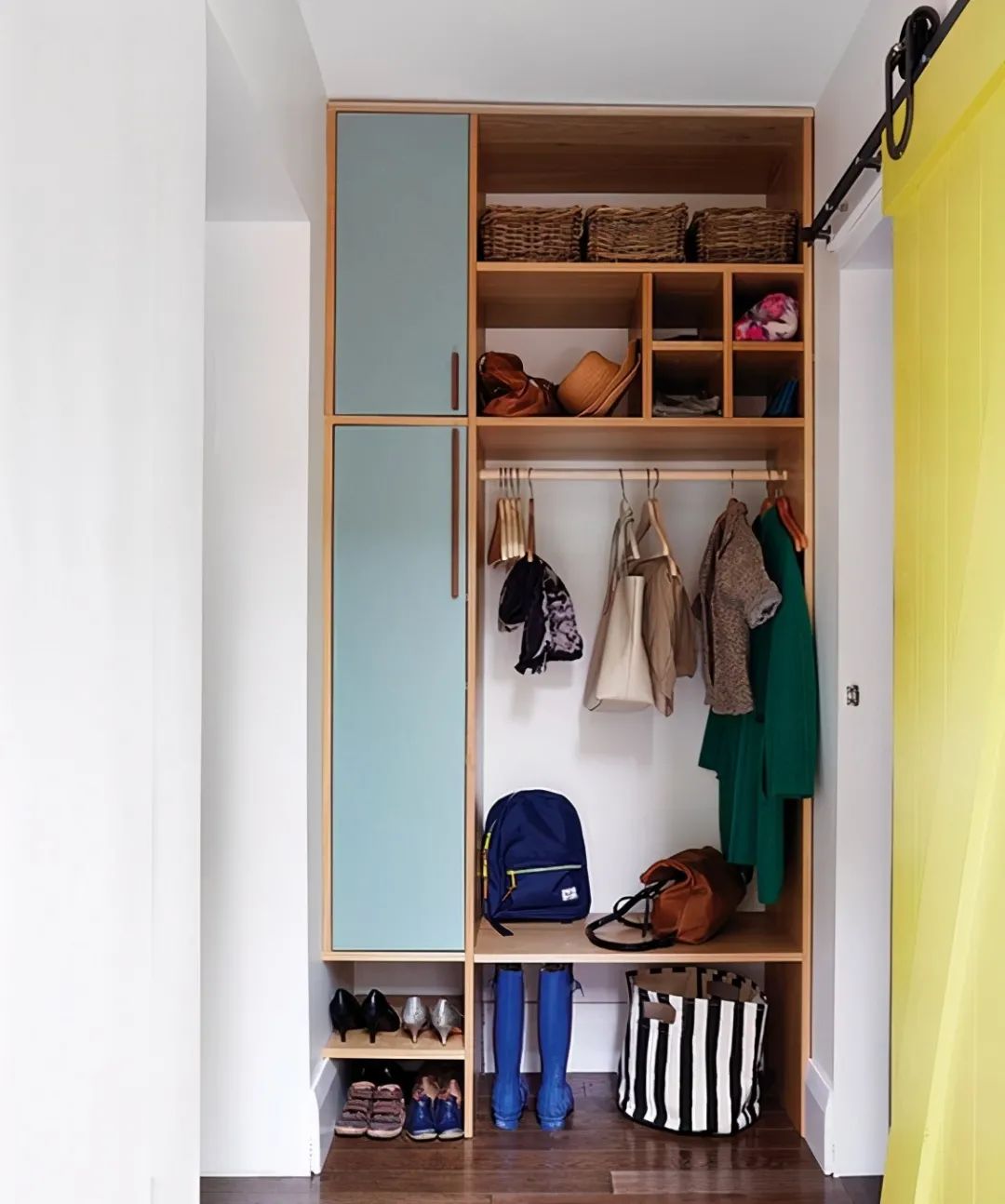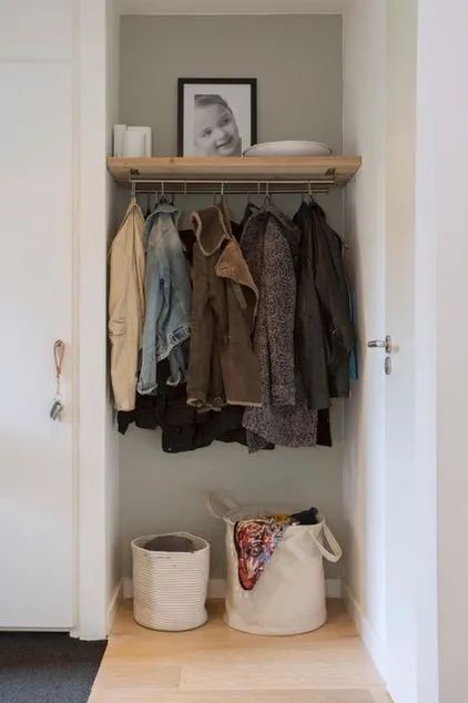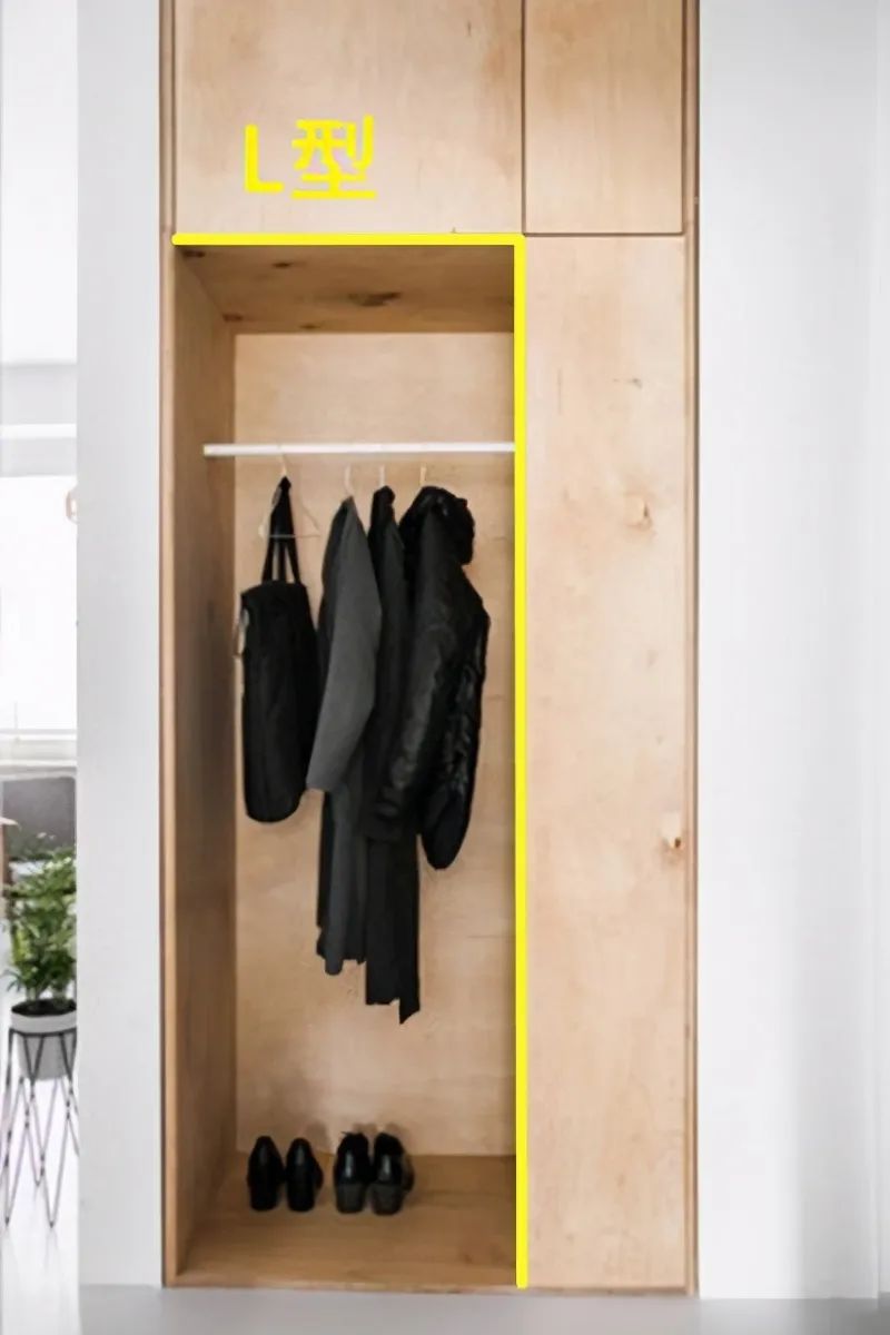 如果可以利用的墙面空间大一点,也可以试试这种,一侧打L型柜子存储空间更充足,左下方留出一部分空间做开放式处理,仅仅装1个晾衣杆下方置放鞋子即可。