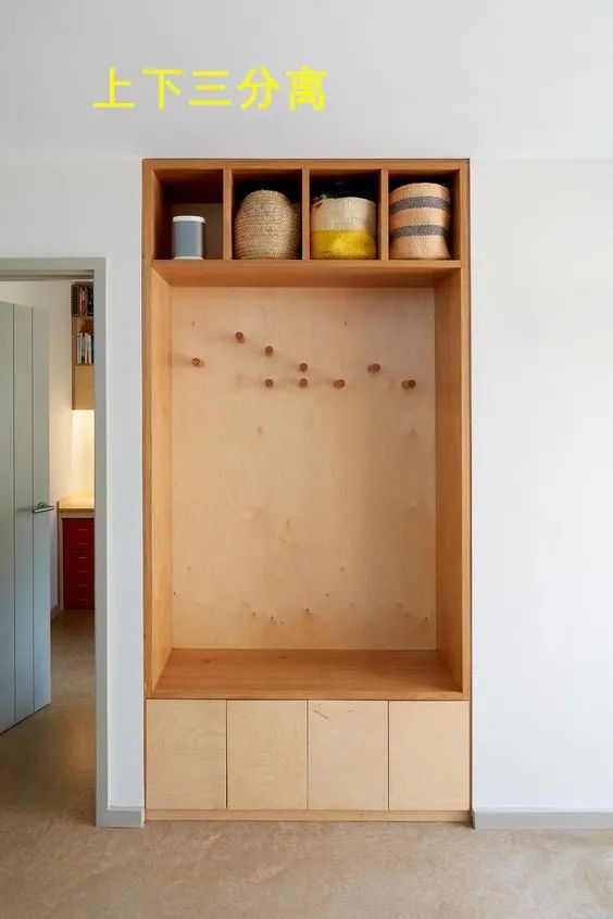 这种适合玄关墙面空间比较窄的家庭使用,最上方做开放式置物架存放不常用物品,中间靠背空间安装一个衣杆或多个分离式挂钩,可以挂放进出门脱下的衣物。而最下方打上换鞋凳,比较方便。