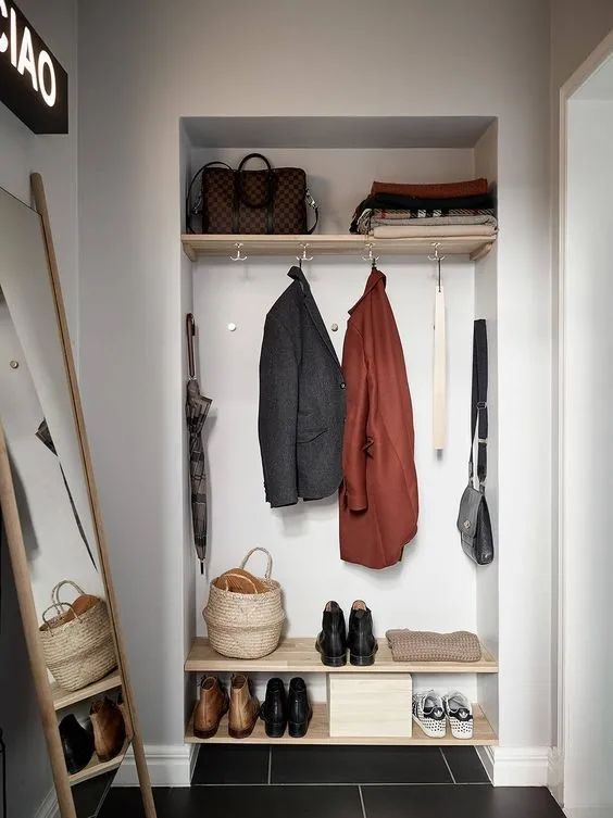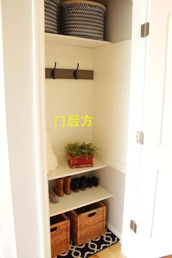 你们可以选择利用门后方空间,家里来人的时候门一关还能起到一个遮挡的作用,保护隐私也不占地。如果家里有两层的话,楼梯下方空间也能利用上,内嵌式的玄关柜空间,也能作为步入空间使用。