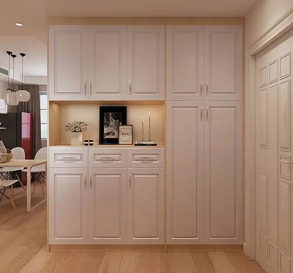 玄关只放鞋柜,那就太鸡肋了。玄关柜真的能解决太多问题了,平时一进家门的钥匙、包包、衣服等等都可以随手挂挂钩上、下方的鞋柜放20双鞋子不成问题、上面的收纳柜也能把不应季的衣物收藏起来,真的是很便利。