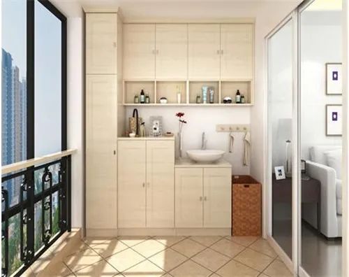 有条件的话,无论是生活阳台还是休闲阳台,最好都打个吊柜收纳,洗衣机柜是少不了的,吊柜虽说收纳不多,但是最起码能放点洗涤用品,阳台收拾的清爽干净,家里的风水和财运也好很多。
