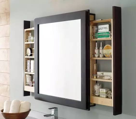 目前比较流行的洗手台收纳,就是镜柜的设计,把镜子和柜子结合在一起,把一些化妆品、小杂物都藏到镜子里面,或者是在镜子的周边,做一些隔板、收纳的设计,把洗漱用品摆上,也非常实用。
