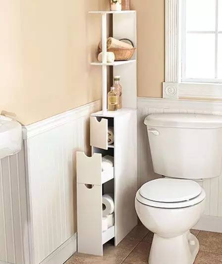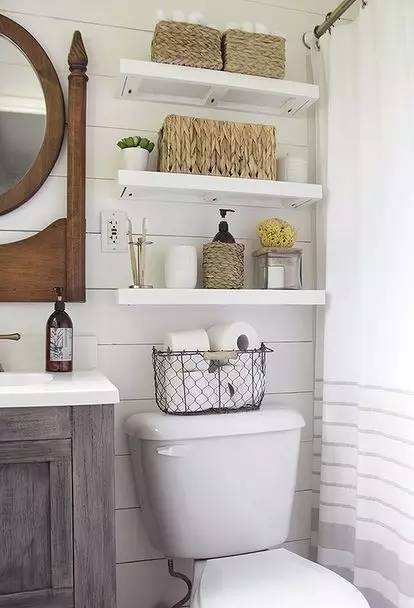马桶作为卫生间必不可少的地方,在马桶的上方和周边做收纳,是比较常见的设计,不管是隔板架、柜子还是楼梯、架子等,充分的利用马桶的四周,把合适的东西都装在这里,不浪费卫生间的每个角落。