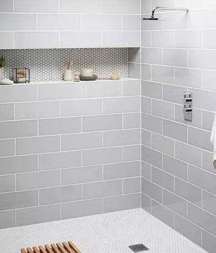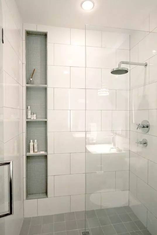 淋浴房里面,正常都是做壁龛的比较多,或者有人不喜欢墙面被破坏的,会去买一些角落里的置物架,这个空间的收纳比较少,主要就是为了摆放沐浴露、洗发水等洗浴用品,一般来说一个壁龛就够了。