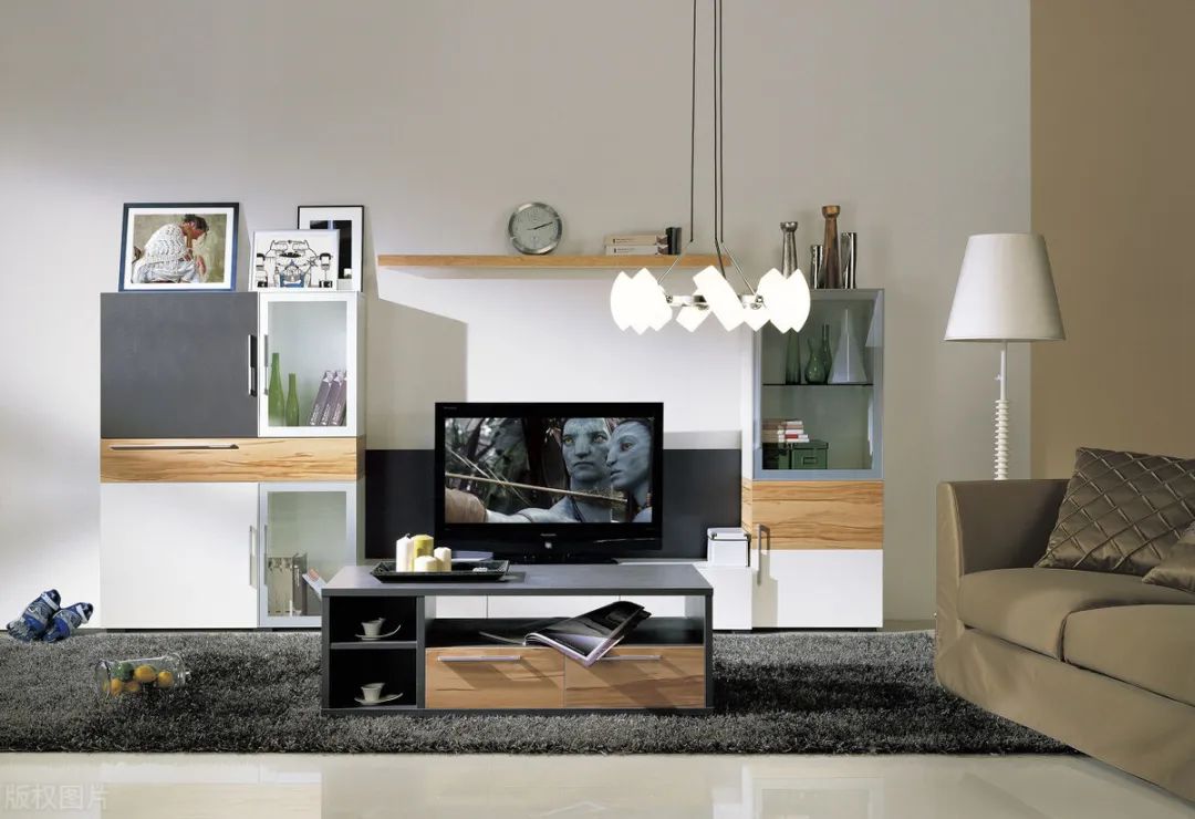 如果是小户型客厅实际面积小,可以将灯具安装在茶几和电视中间,这种设计方式观看电视效果更舒服。