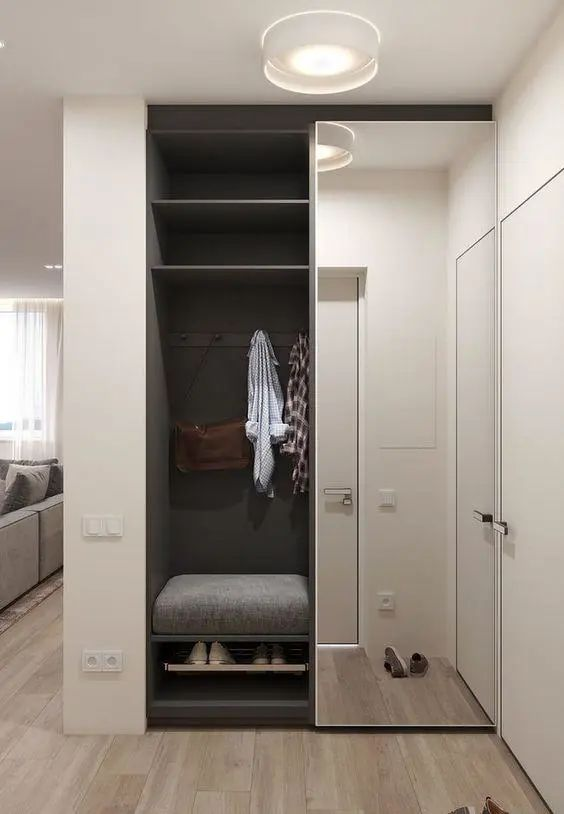 在上面的吊柜下还可以加根杆子,直接做开放式挂衣区,回家后挂放包包外套不是很省心?里面内嵌的镜子直接当穿衣镜,不要太实用方便!