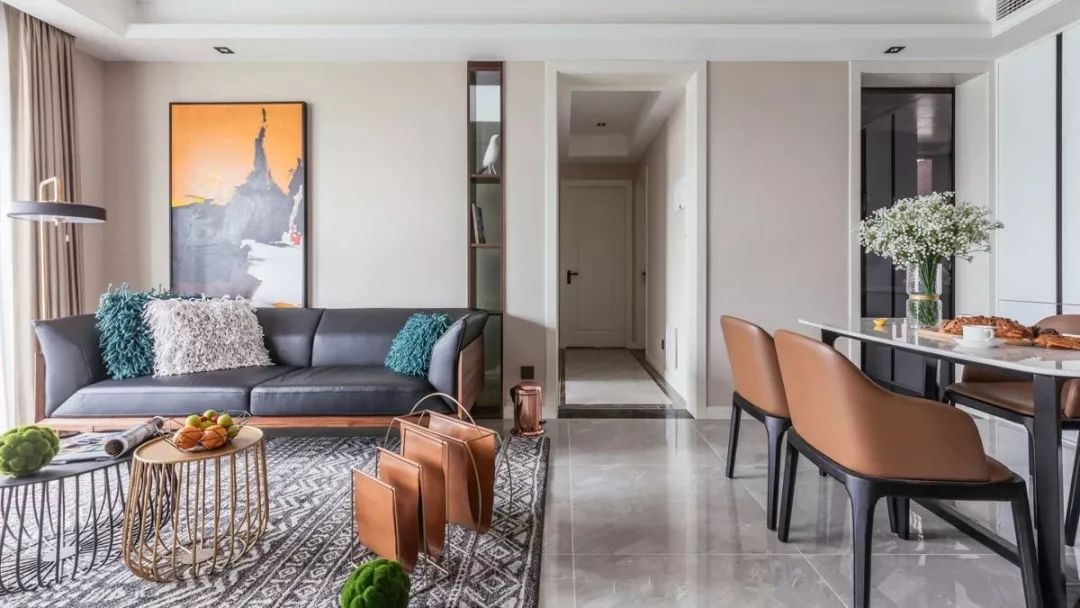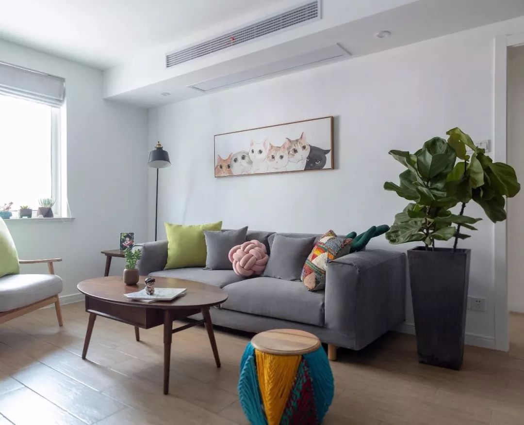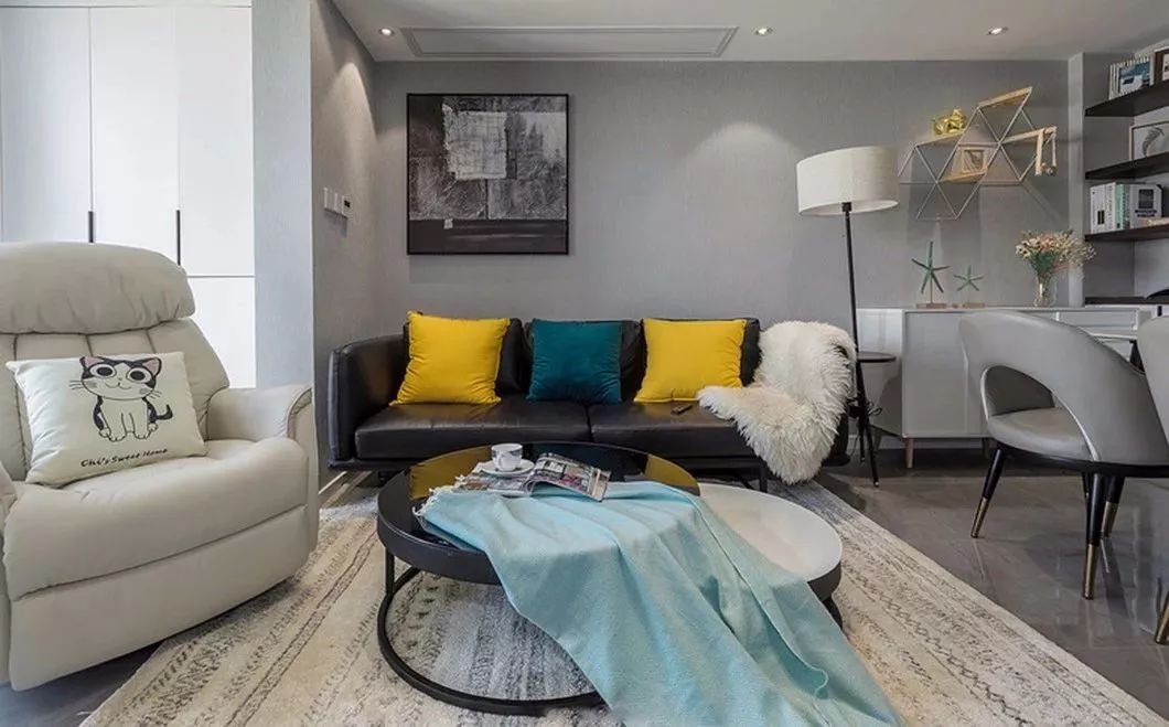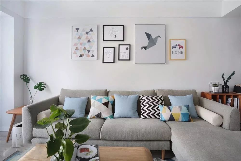 对于沙发背景墙面积不大的,可以选择摆放一幅比较大的挂画在墙面的一角,然后留空一部分的区域,营造出差异感,让客厅看起来更宽敞一些。