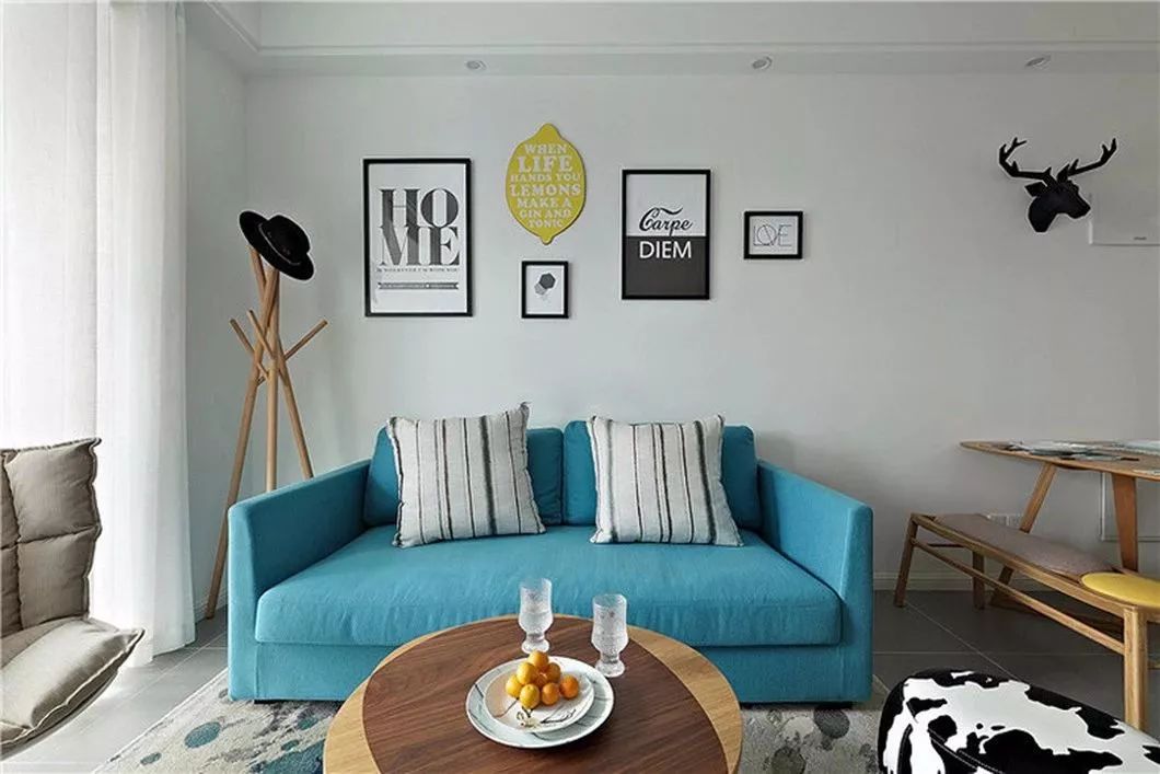 更多的小户型屋主是会选择对称的摆放方式,两幅相近而又不同的挂画,大小相同,以沙发中心点对称摆放,看起来更为舒服一些。