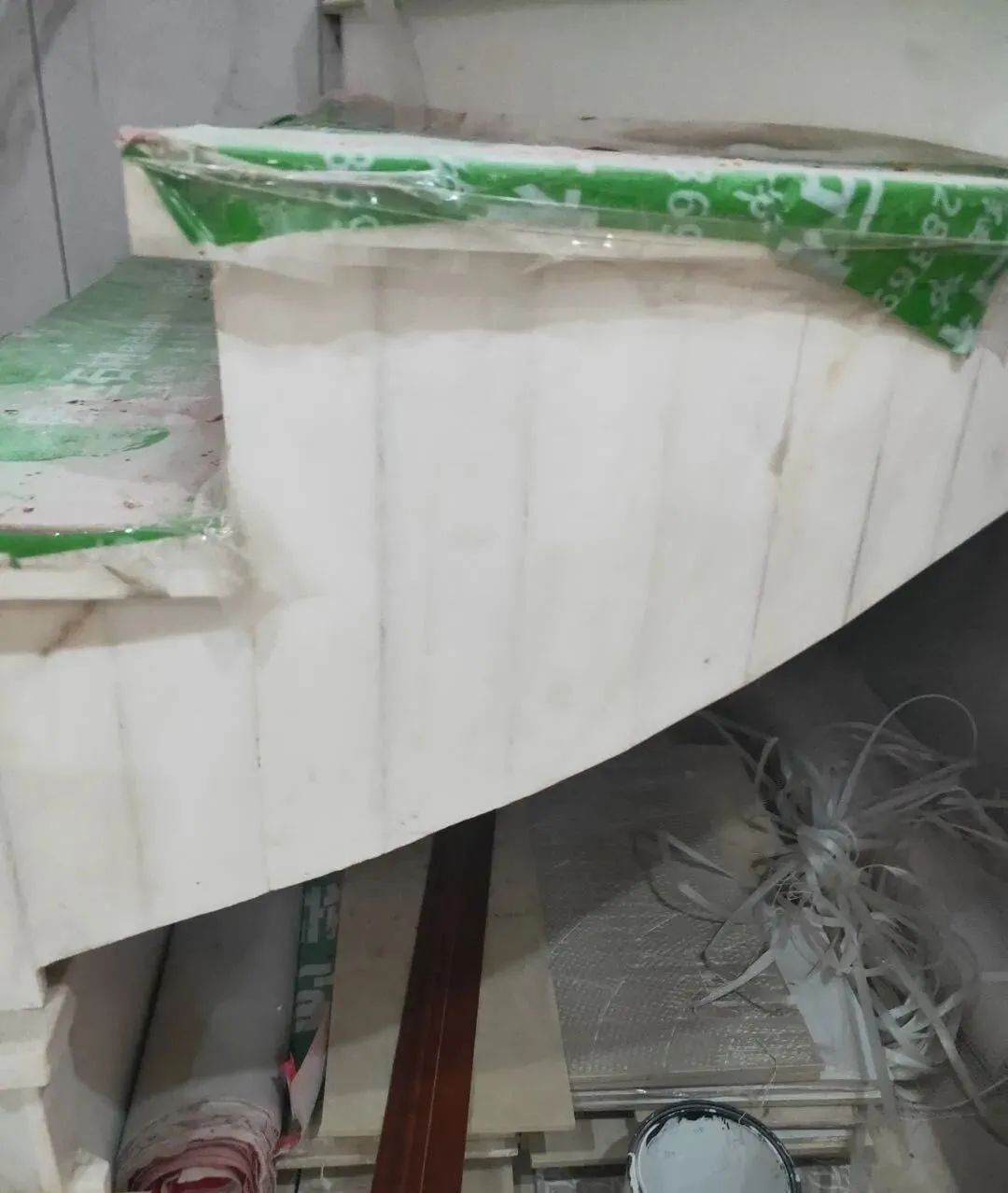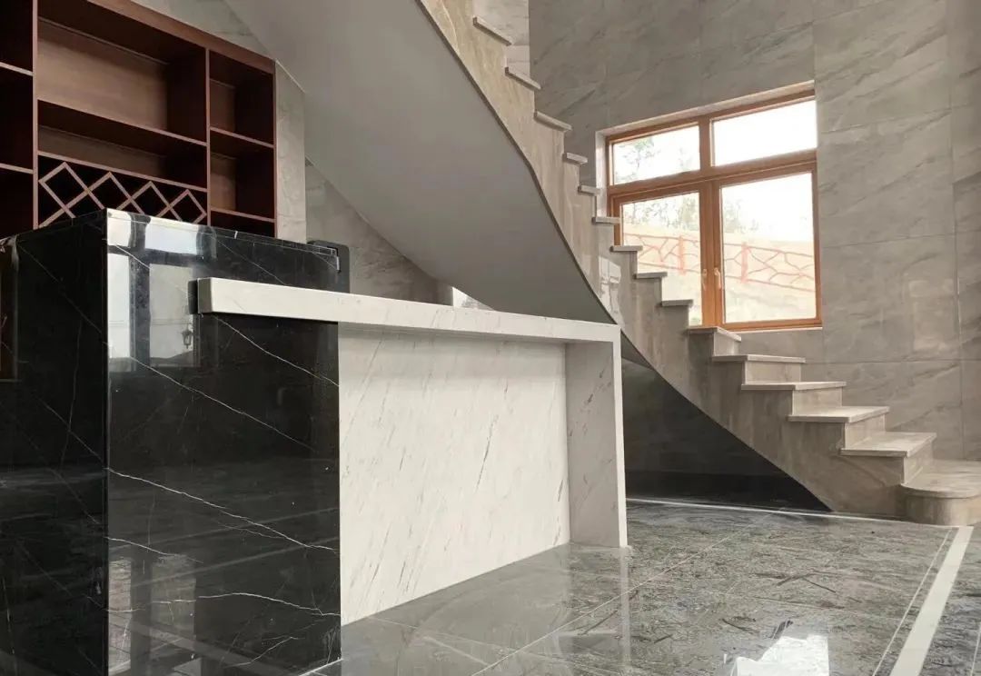 第三种,弧形的立体平面,比如,弧形楼梯的上下盖板。弧形楼梯的上口盖板和低口收口板,不是简单的平面弧形了,而是立体的弧形面,需要拼接位置很多而且打磨深度比较大。所以岩板的硬度和花纹和拼缝处理上来说都不适合来做弧形的立体平面。