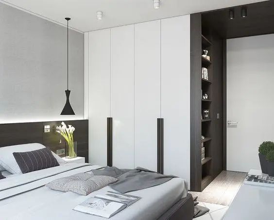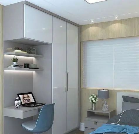 衣柜与书柜一体的设计,可能比较适合正在读书,学生的卧室吧。本身衣服不会太多,侧面做成书柜,可以更好的存放书本,分门别类,拿取方便。