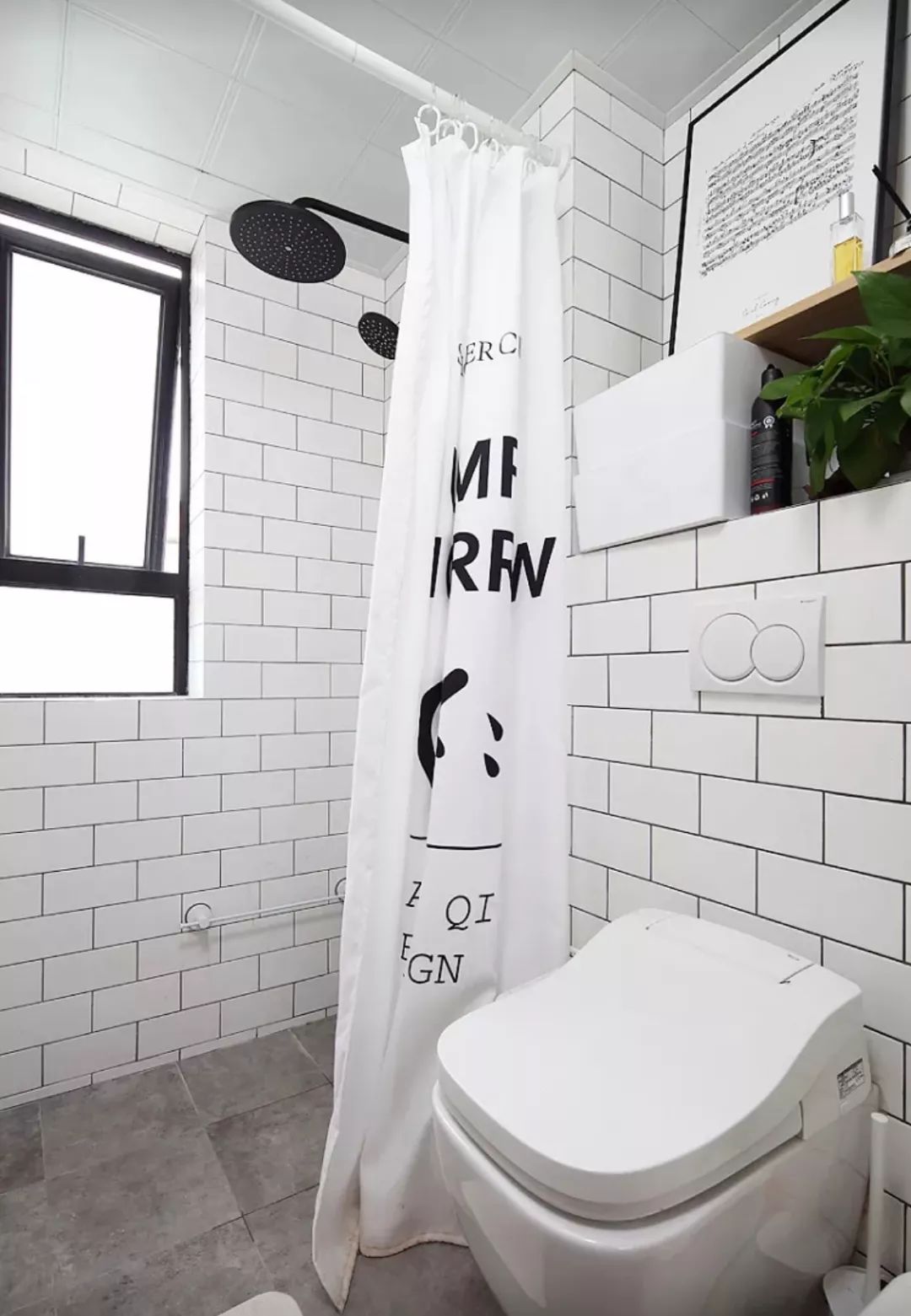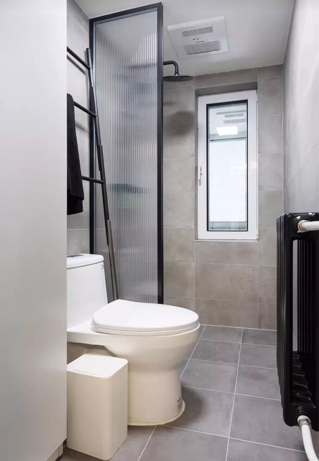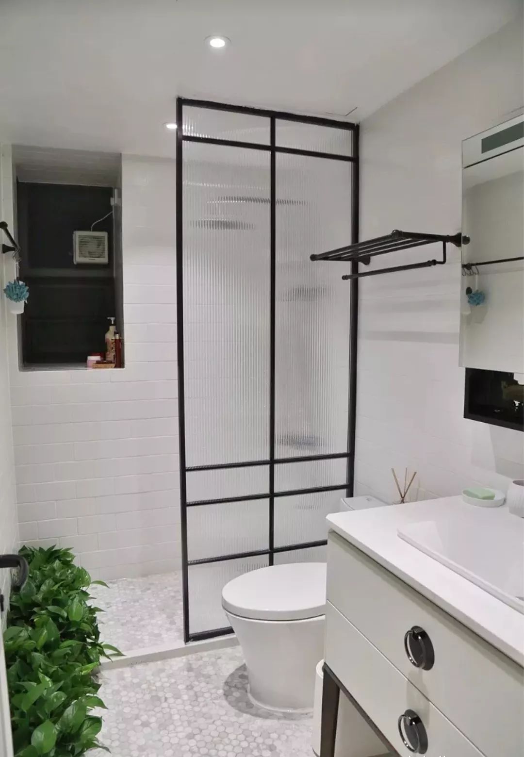 在淋浴区和马桶之间加上一个黑框的玻璃隔断,底部加上挡水条,这样来保证卫生间内的干湿分离需求,又能让光线流通起来。