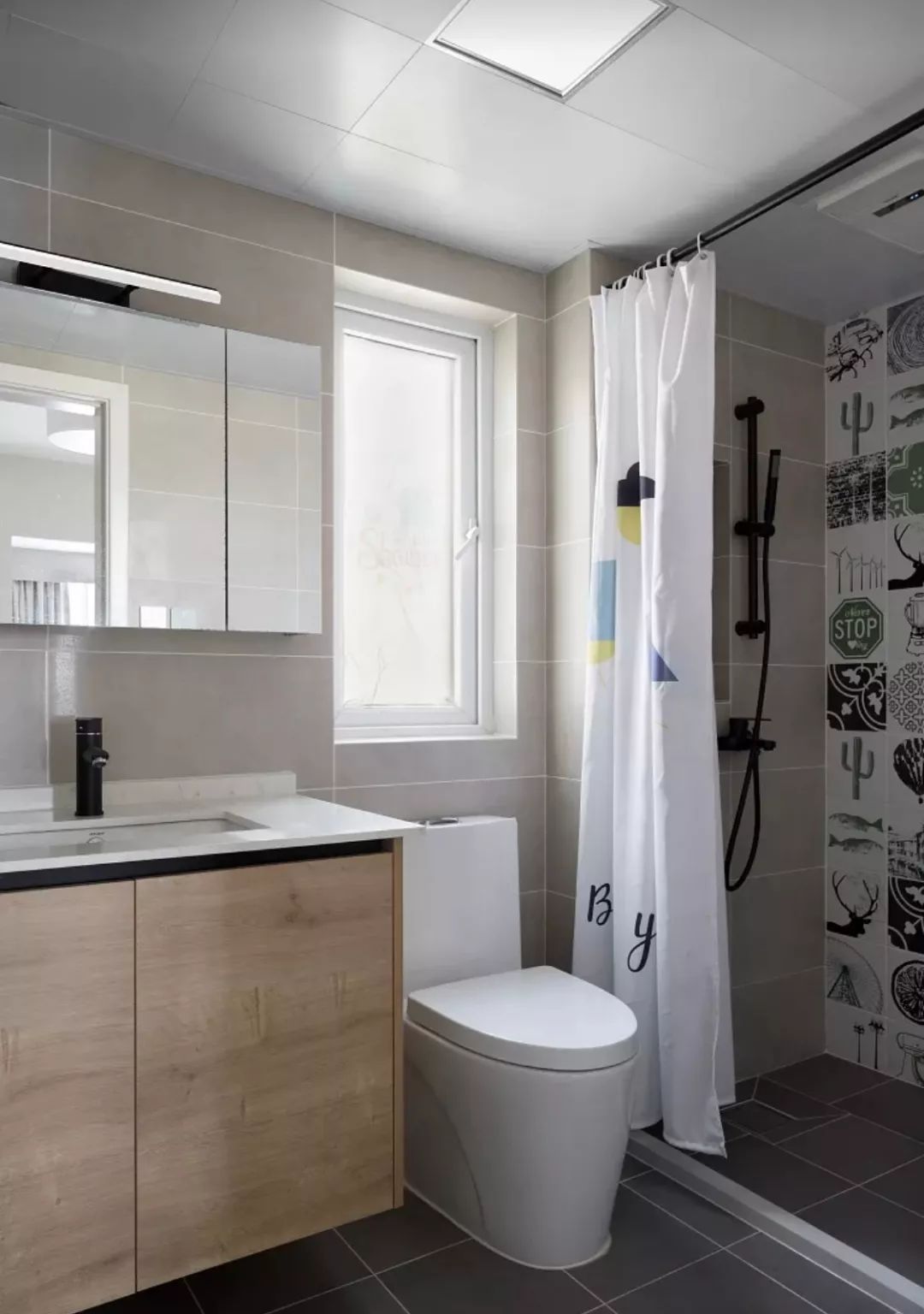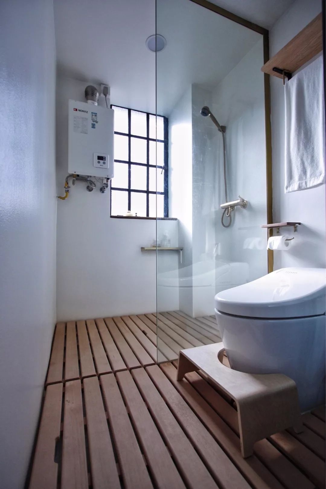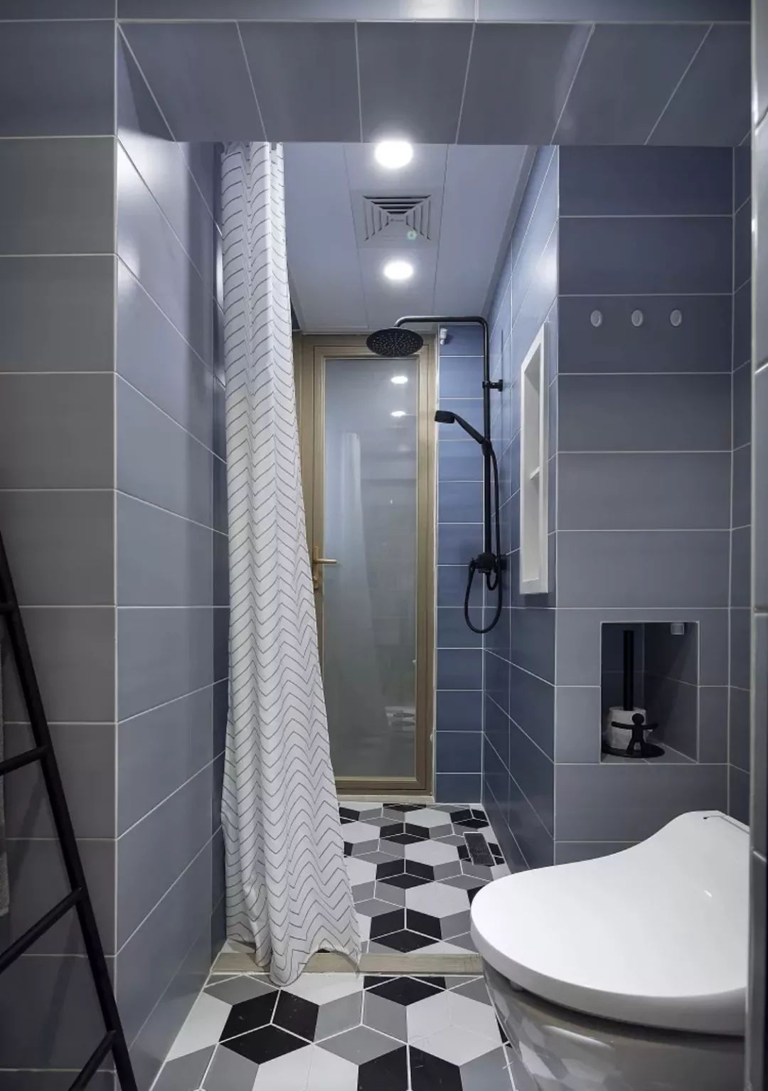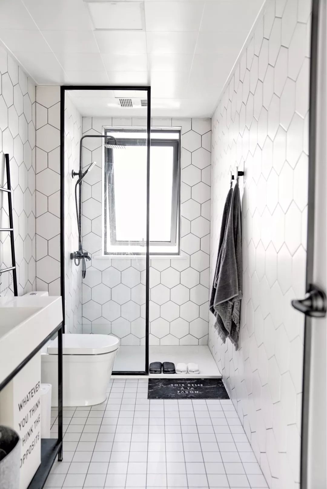 在淋浴区和马桶之间加上一个黑框的玻璃隔断,底部加上挡水条,这样来保证卫生间内的干湿分离需求,又能让光线流通起来。
