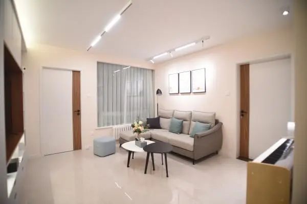 背阴的客厅忌用一些沉闷的色调。由于受空间的局限,异类的色块都会破坏整体的柔和与温馨。宜选用白榉饰面,枫木饰面或亚光漆家具,浅米黄色柔丝光面砖。墙面采用浅蓝色调试一下,在不破坏氛围的情况下,能突破暖色的沉闷,较好地起到调节光线的作用。