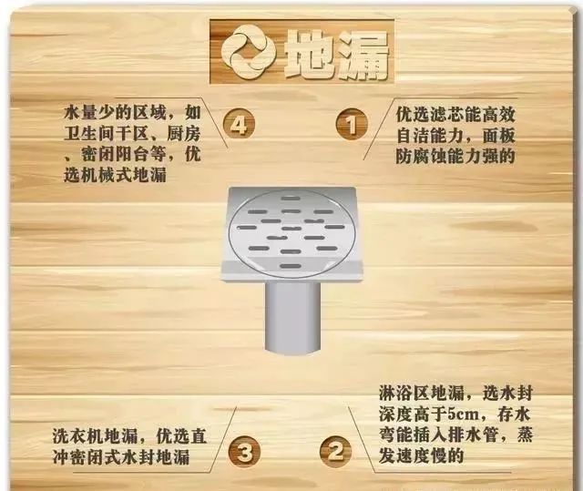2、淋浴区的地漏,水封深度要大于5cm,存水弯可以插进排水管里,蒸发速度就变慢了。