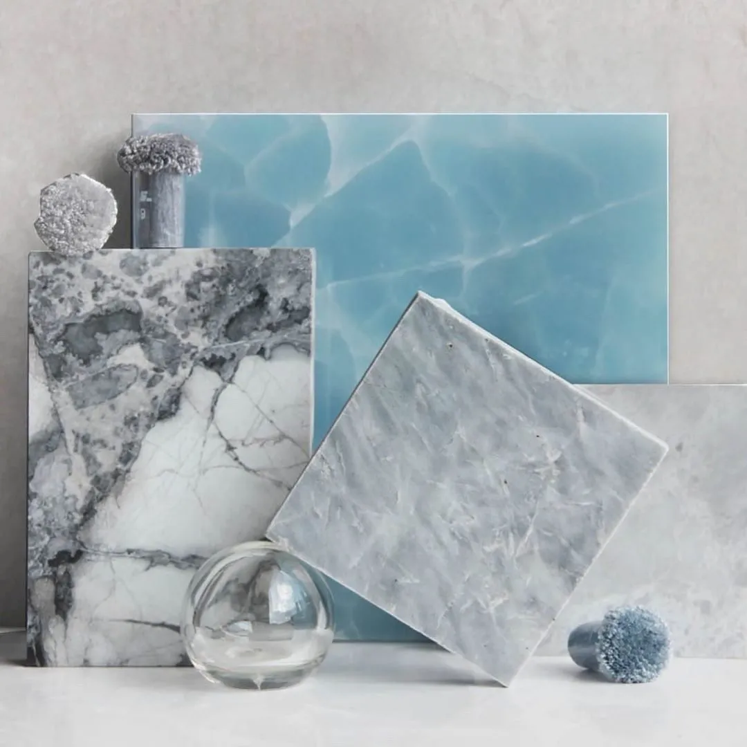 石材依照色系、种类排列,挑选时要考虑纹路的整体性,而纹路颗粒越细致,代表质量越佳。