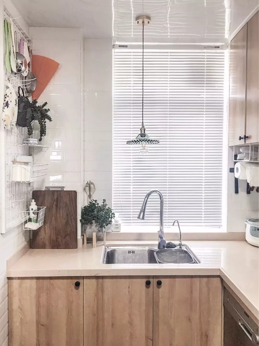 小户型厨房的收纳可以不用吊柜,毕竟墙面做满柜子容易造成压抑感,推荐用隔板、挂篮等代替,拿取东西也方便一些。