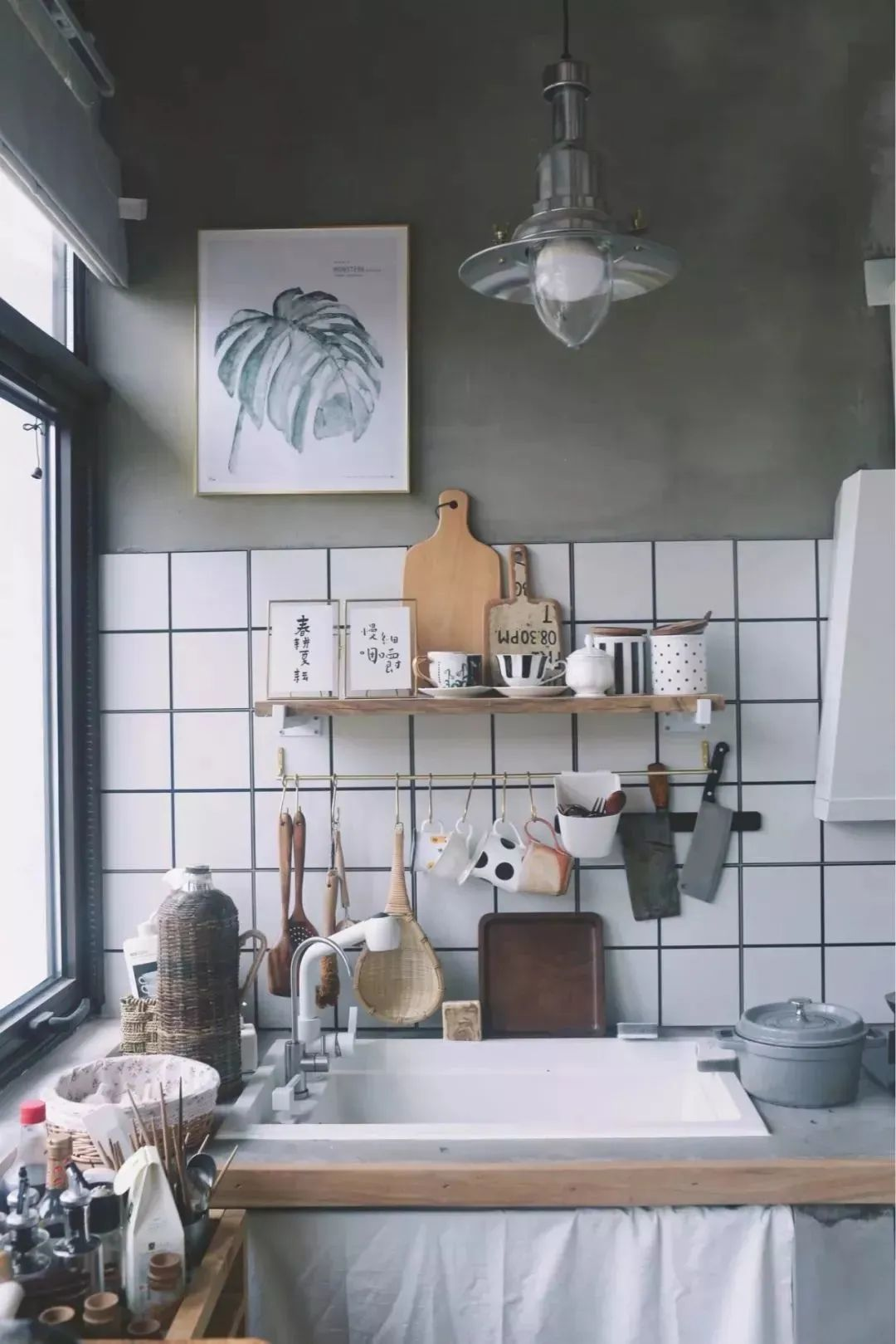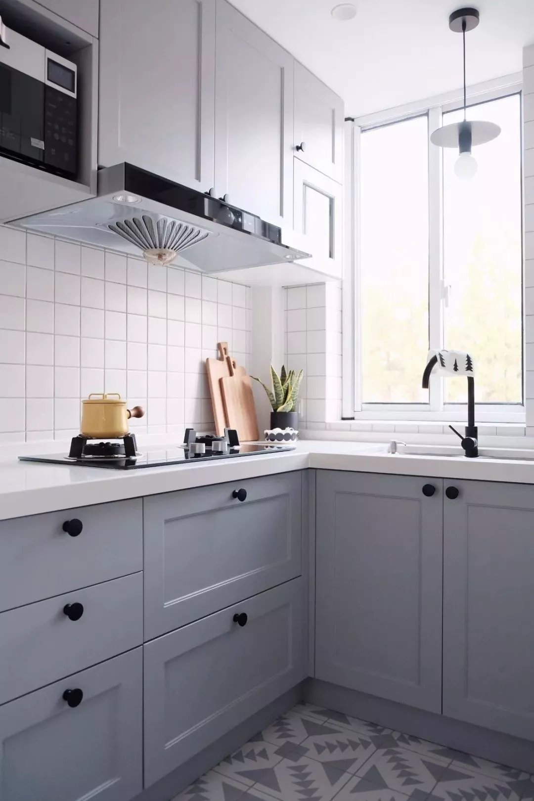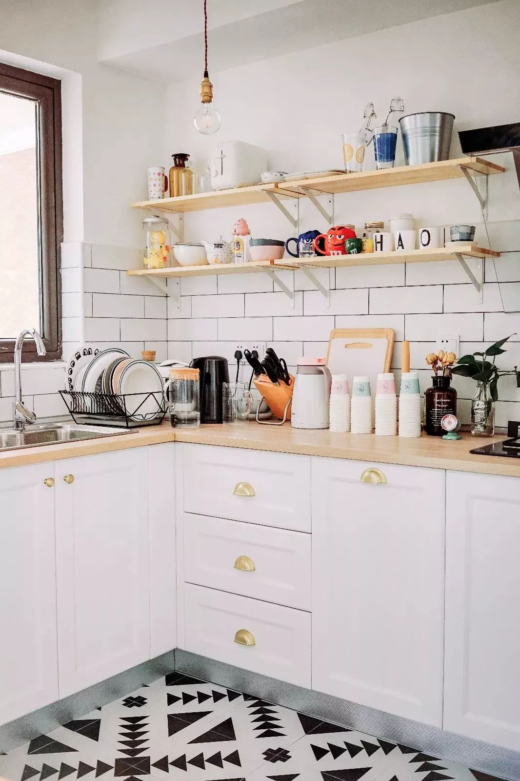 地面的花砖结合白色的橱柜,墙面点缀一些木色的隔板,这样的小户型厨房,真的是让人一眼就爱上,有设计感、颜值又有收纳和方便使用。