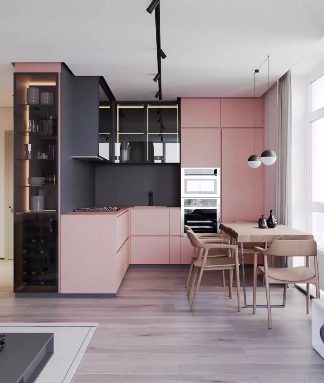 还有粉色作为橱柜的设计,开放式的厨房通常也需要起到装饰性的效果,在厨房的颜色搭配和整洁度上都要多花心思。