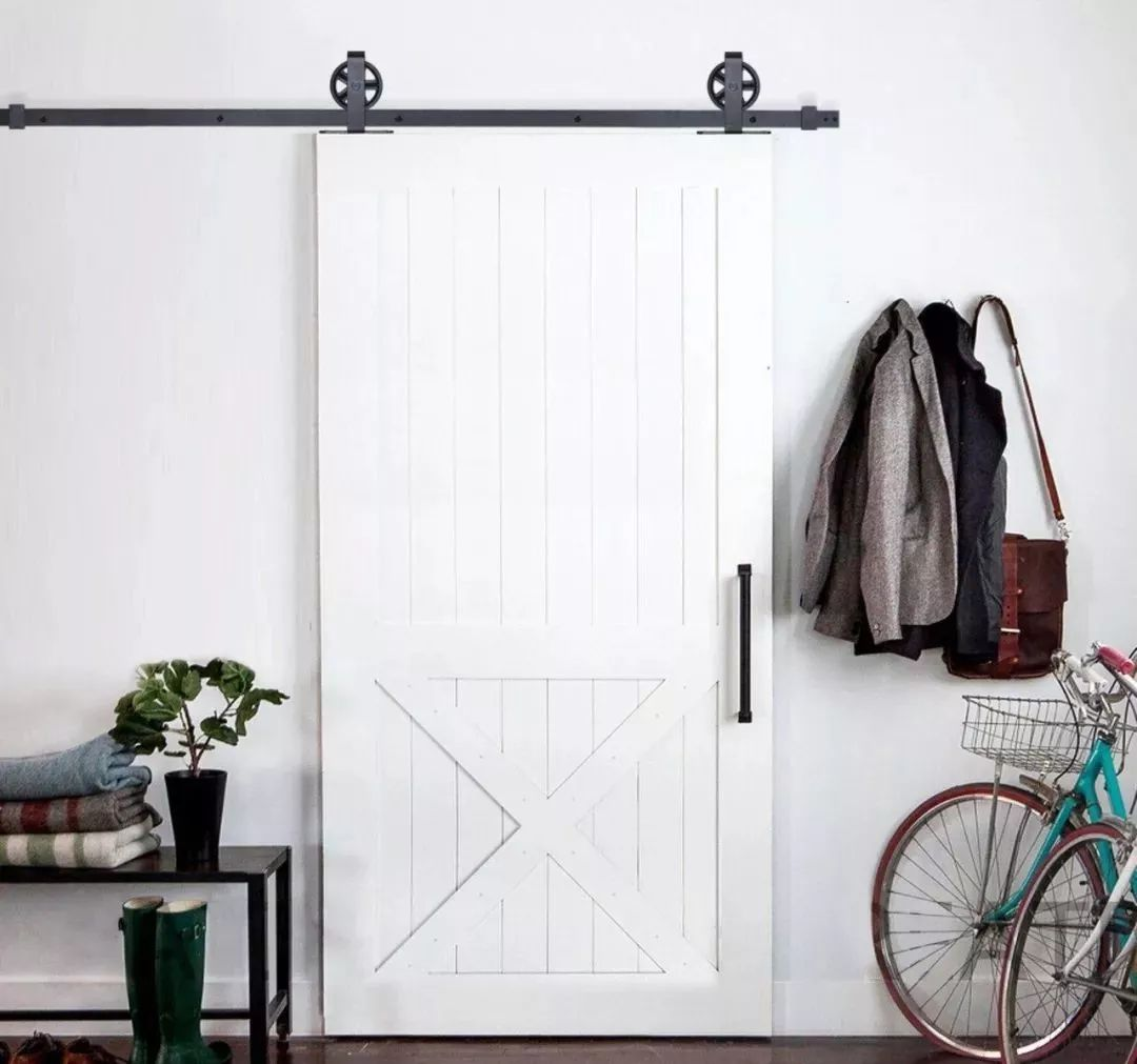 谷仓门就是上图所以的款式,属于吊轨门,顶部的吊轨和滑轮裸露出来,搭配木质门的一些造型,起到很好的装饰效果。