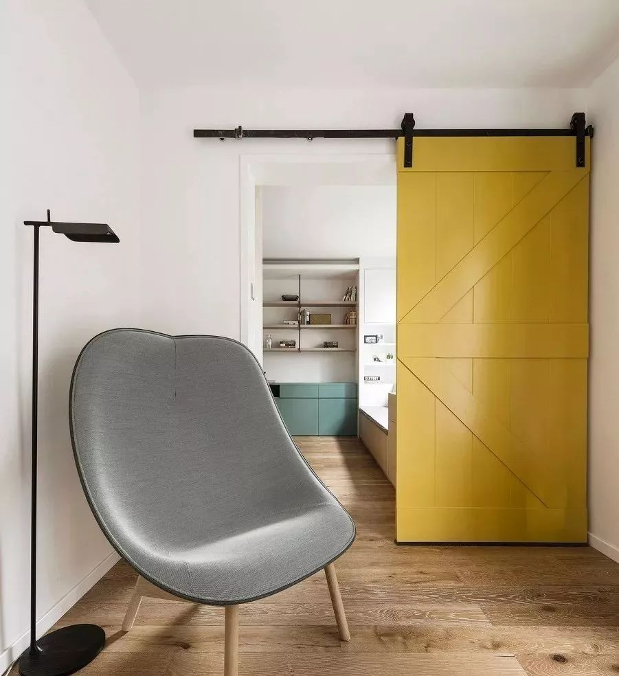 小户型也可以选择一些不同色调的谷仓门,比如黄色、红色等,根据具体的风格来定,谷仓门的后方还可以隐藏一些收纳格。