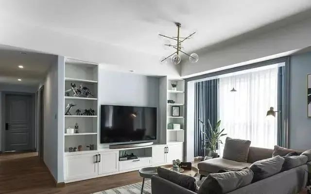 ▼电视既可以摆放在隔板与吊柜的中间,也可以独立形成一个区域,让电视背景墙更具备立体感和设计感。