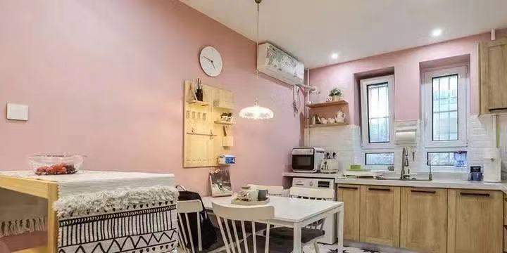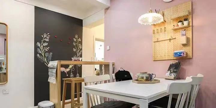 客厅背景墙上采用粉色的格调,搭配白色的餐桌,显得非常温馨有格调,白色的餐桌非常精致宽敞,搭配几把舒适的椅子,轻松容纳一家人吃饭用餐,让人感觉非常轻松舒适。在餐厅背景墙上装饰了精美的装饰品,使得餐厅显得更加时尚有格调。