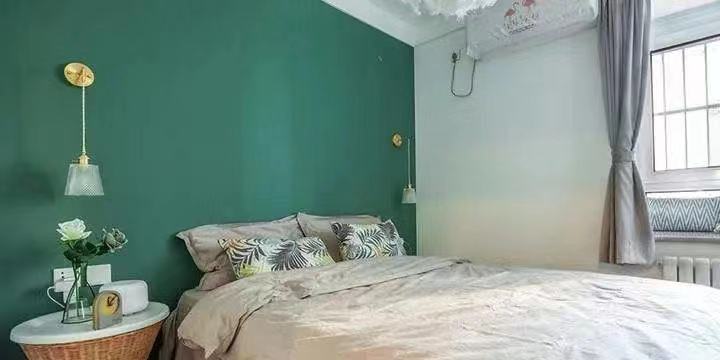 床头背景墙上采用藏青色的格调,与周围白色的墙壁非常好的搭配在一起,显得非常时尚有格调,大床非常精致,搭配舒适的被褥和抱枕,使得卧室显得非常温馨舒适。