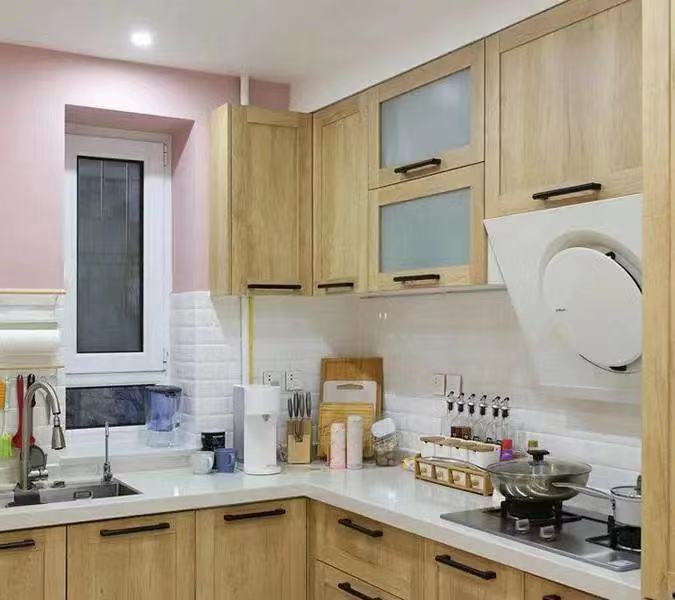 浅色的实木橱柜非常精致,有着丰富的储物柜设计,搭配一组精致的吊柜,能够将厨房的物品分门别类的收纳起来,日常做饭拿取更加便利,也让室内显得更加整齐大方。